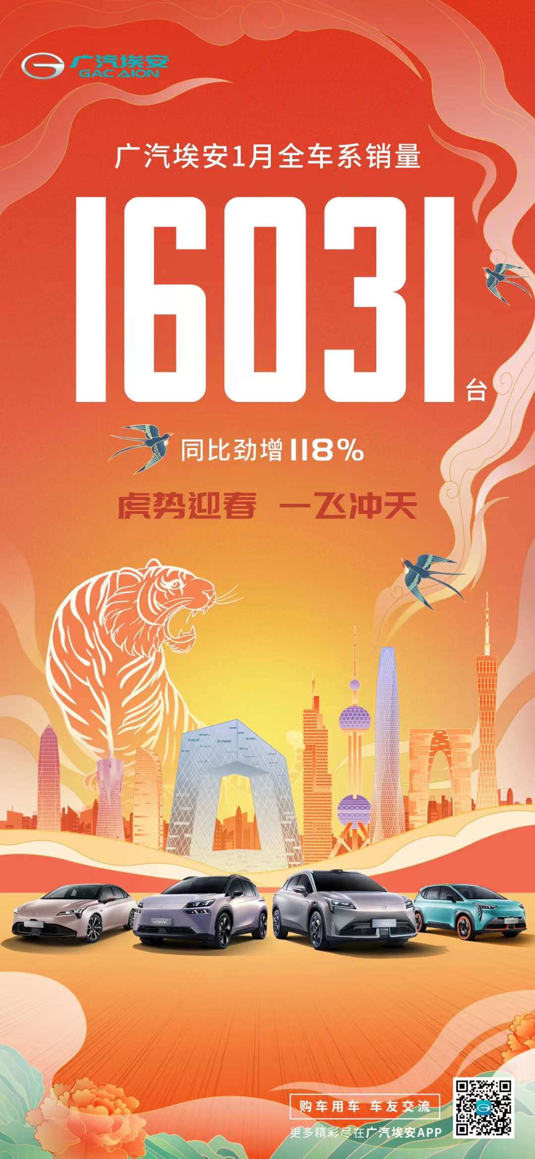 2月1日,广汽埃安官方公布了1月份销量数据,AION家族1月份全车系销量16031台,同比劲增118%。