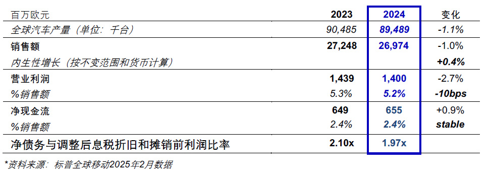 尽管全球汽车产量下降1.1%并面临客户和地域组合的不利影响,销售额仍然达到270亿欧元(指导目标:268亿欧元至272亿欧元),内生性增长0.4%,超出150bps。