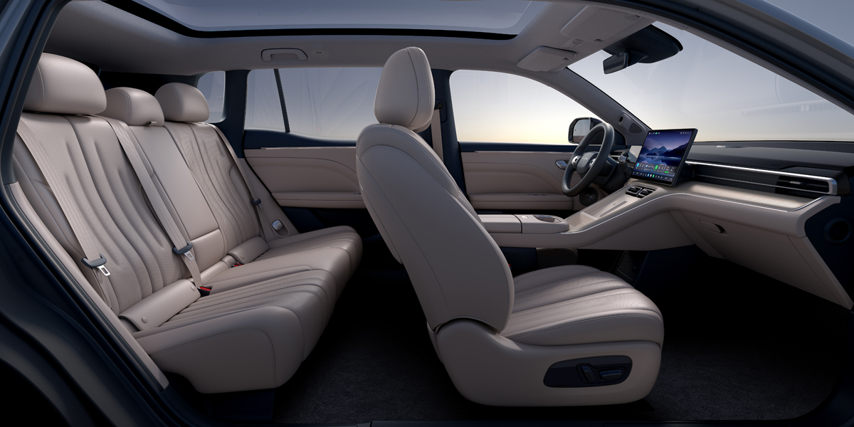 进入车内,大量圆弧设计营造了温馨的居家氛围,带来了舒展的环抱感。高频触摸区域大量使用软包,豪华品质拉满。近4米长的、32色柔光氛围灯,环绕着座舱,进一步强化了家的温馨氛围。
