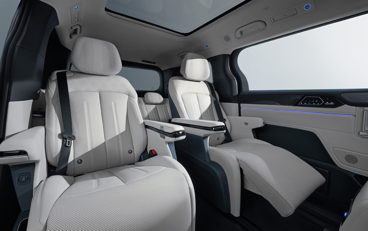 第三排座椅支持翻转折叠加前后移动,靠背可向前倾斜100°放倒,又能前后移动100毫米,扩展容纳空间;并可以前后移动/复位、靠背电动调节、座椅翻转放平/复位。
