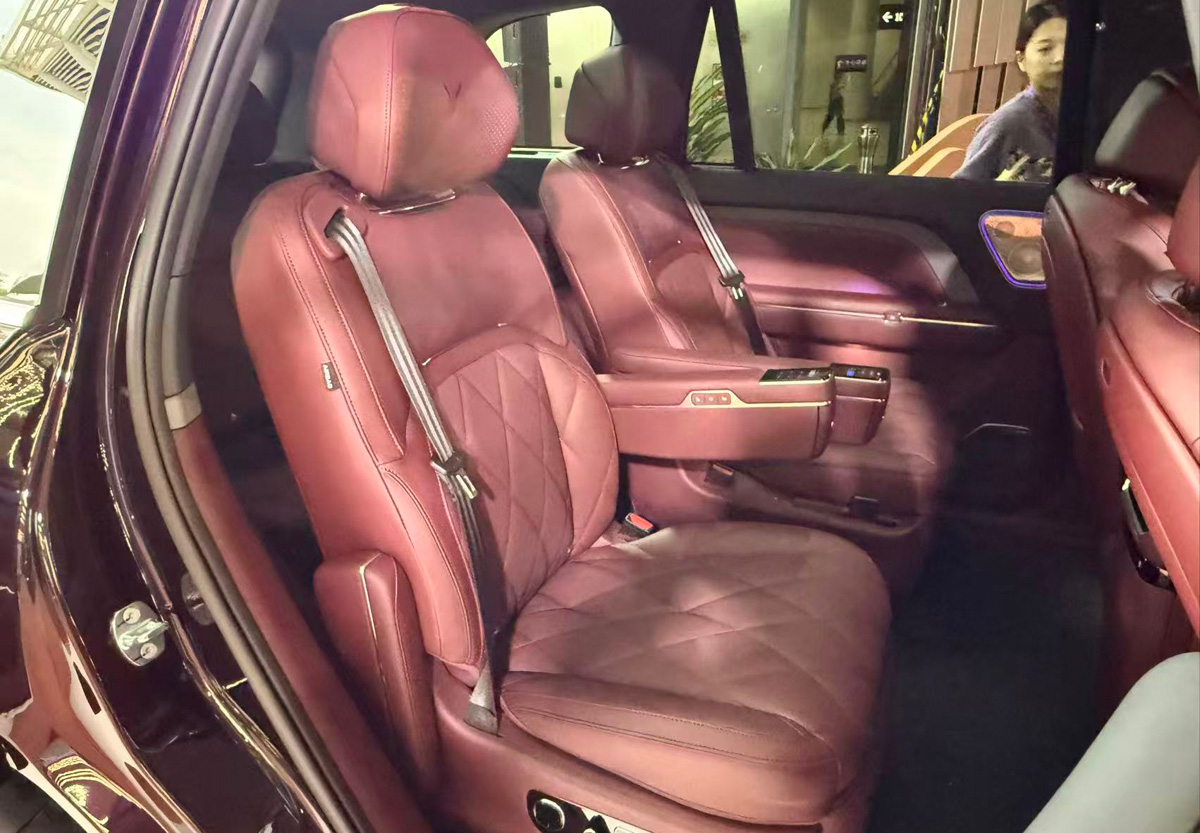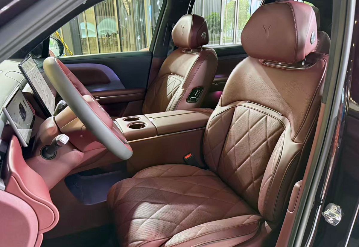 全舱软包悬浮设计,而且车内通过5种不同规格皮革打孔交叠,并在主副驾侧门、仪表台、中控面板、二三排两侧门板高配主副驾座椅后方等位置嵌入山水流韵木饰。内饰共有玄红、暖棕、云米等3种颜色。