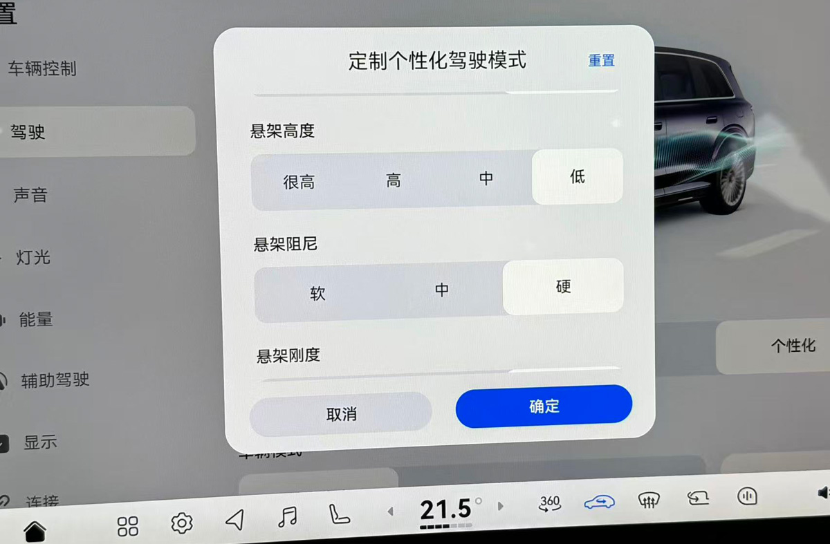 岚图泰山搭载了三腔空气悬架,通过两个刚度阀控制三个气室,实现四种弹簧刚度组合。结合EDC电磁减振,系统可毫秒级响应路况。支持5档高度与4档刚度调节,调节跨度达65%,并配备7种驾驶模式。