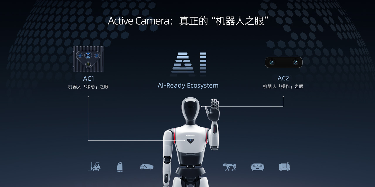 在硬件上,该方案构建了完整的感知与执行体系。Active Camera系列传感器作为“机器人之眼”,其中AC2负责提供近距离高精度的立体与彩色信息,支持精细操作感知;AC1负责远距离导航避障。末端则配备了具备多组力触觉点阵的灵巧手,触觉信号的反馈有效解决了视觉盲区问题,确保了操作的柔顺与精准。展台上,AC1、AC2、多自由度灵巧手等产品均单独展出。