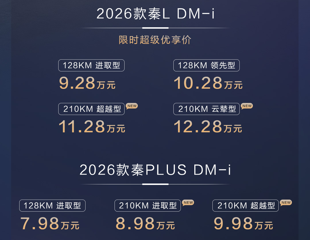 其中,2026款秦L DM-i 210KM长续航版限时超级优享价11.28万-12.28万元,2026款秦PLUS DM-i 210KM长续航版售价8.98万-9.98万元。