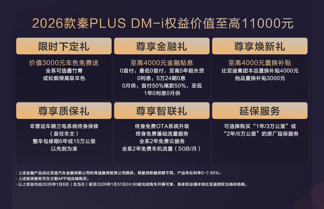购买2026款秦PLUS DM-i 210KM长续航版的用户可享受至高11000元的多重权益。在1月31日前下单,不仅有至高4000元置换补贴,还免费送价值3000元的全新车色,更有至高4000元金融贴息。