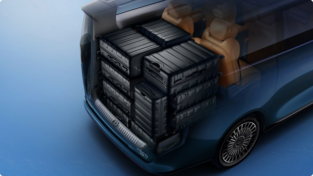 银河V900后备箱空间1100L,可容纳15个20寸行李箱,确保全家行李及家宴食材都能轻松容纳。