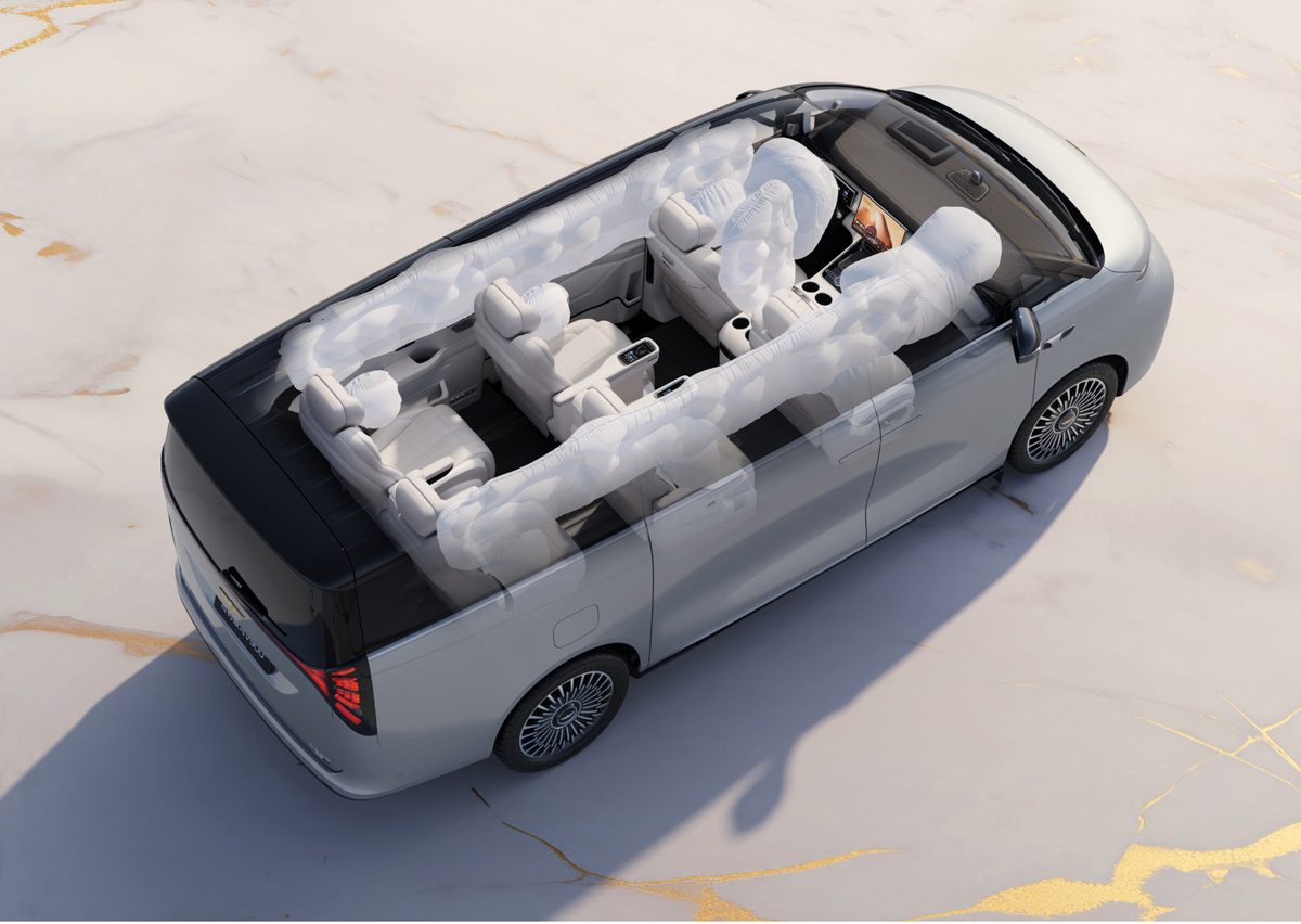 银河V900采用“星甲车身”设计,高强度钢占比76.6%,局部采用2000MPa军工级钢,加上133mm超厚十宫格铝制门槛梁、同级最长447mm铝合金吸能盒、全球最多11处环抱气囊、同级最大224L侧气帘等,堪称一座移动的安全堡垒。