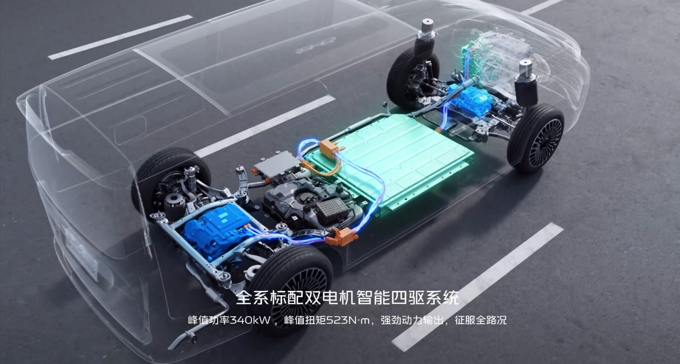 银河V900全系标配智能双电机四驱系统,可输出340kW峰值功率与523N·m峰值扭矩,零百成绩6.5秒,其AI数字底盘,搭载了主动魔毯预瞄、空气悬挂、CCD连续可变阻尼减振器及CST 2.0全速域舒适制动系统。