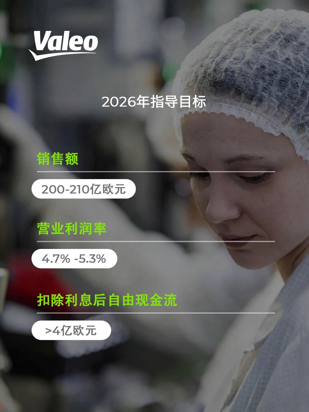 2026年,法雷奥将按照跃升2028(Elevate 2028)战略规划,在依然充满挑战的环境中进一步提升盈利能力和现金生成能力。集团设定了以下目标:销售额达到200亿至210亿欧元之间,体现主机厂配套销售额有机增长持平;营业利润率达到销售额的4.7%至5.3%;自由现金流(扣除净财务利息后)超过4亿欧元。