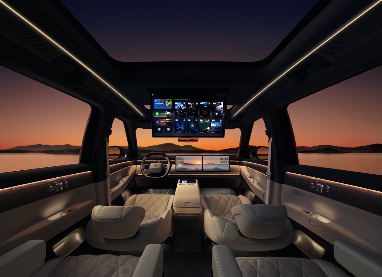 ID. ERA 9X在智能与舒适体验上同样出色。15.6英寸超高清中控主副驾双联屏提供高效人机交互;21.4英寸后排可折叠吸顶大屏搭配视角补偿膜,拓展视野,为后排乘员打造沉浸式影音体验。全车氛围灯总长度达12.8米,采用四层环舱式布局,并结合漫反射光学处理技术,光线均匀铺展,如光瀑般晕染座舱,进一步强化环抱感与放松感。