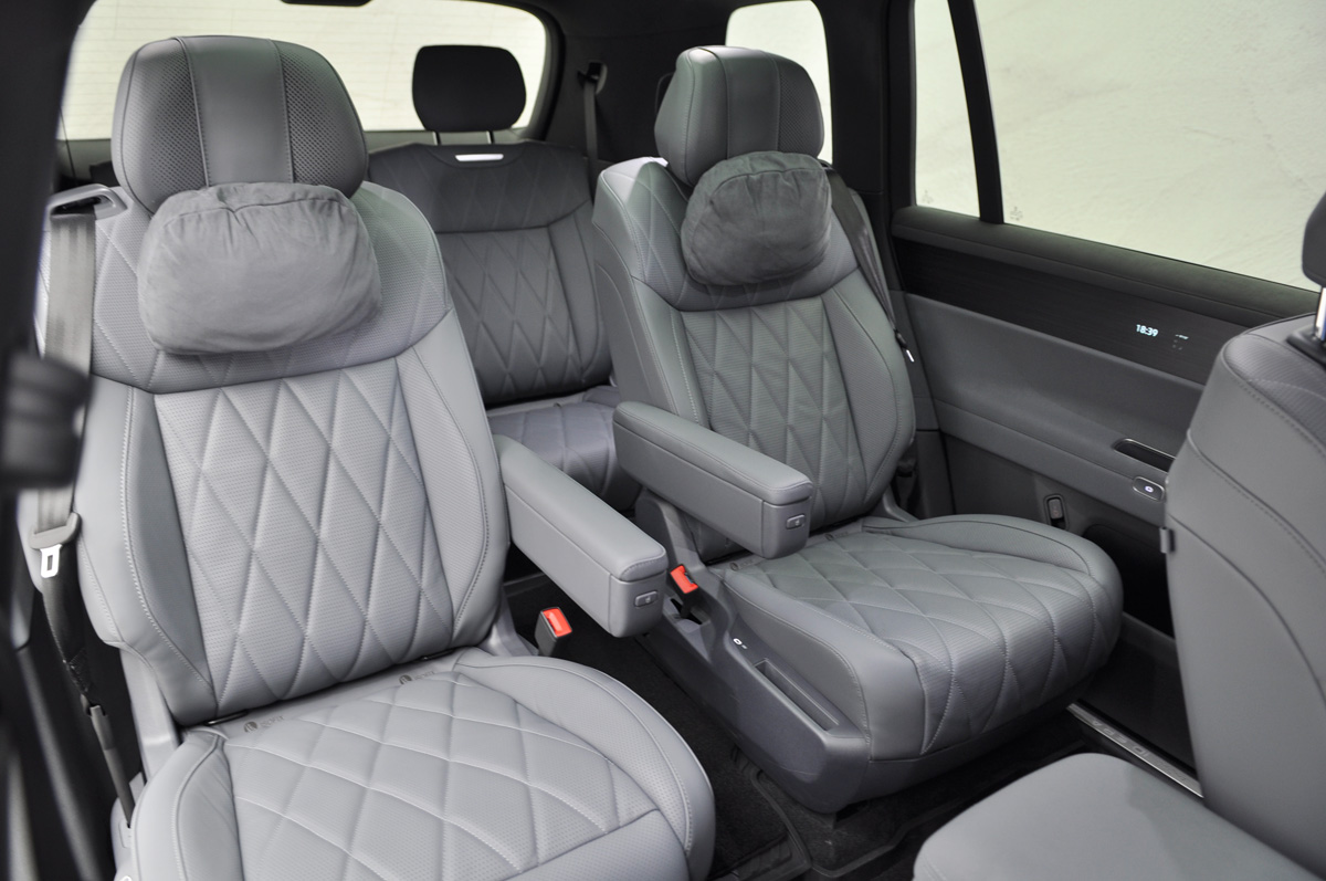 一开始还以为第三排座椅配备了前后滑轨,可以电动前后滑动实现更多的空间可能性和灵活性,但和其它上汽大众的三排座车型一样,这个配置并未出现在ID.ERA 9X上,第三排座依旧固定在了地板上。