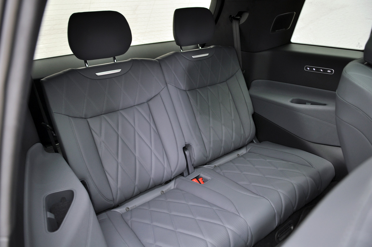 如果配备了电动滑轨,那么第三排座椅的坐姿肯定就会变得更高,压缩了头部空间。为什么不往下去抢空间呢?是因为下方除了后电机,还有复杂的悬架系统,或许不配滑轨,也是不得已而为之。