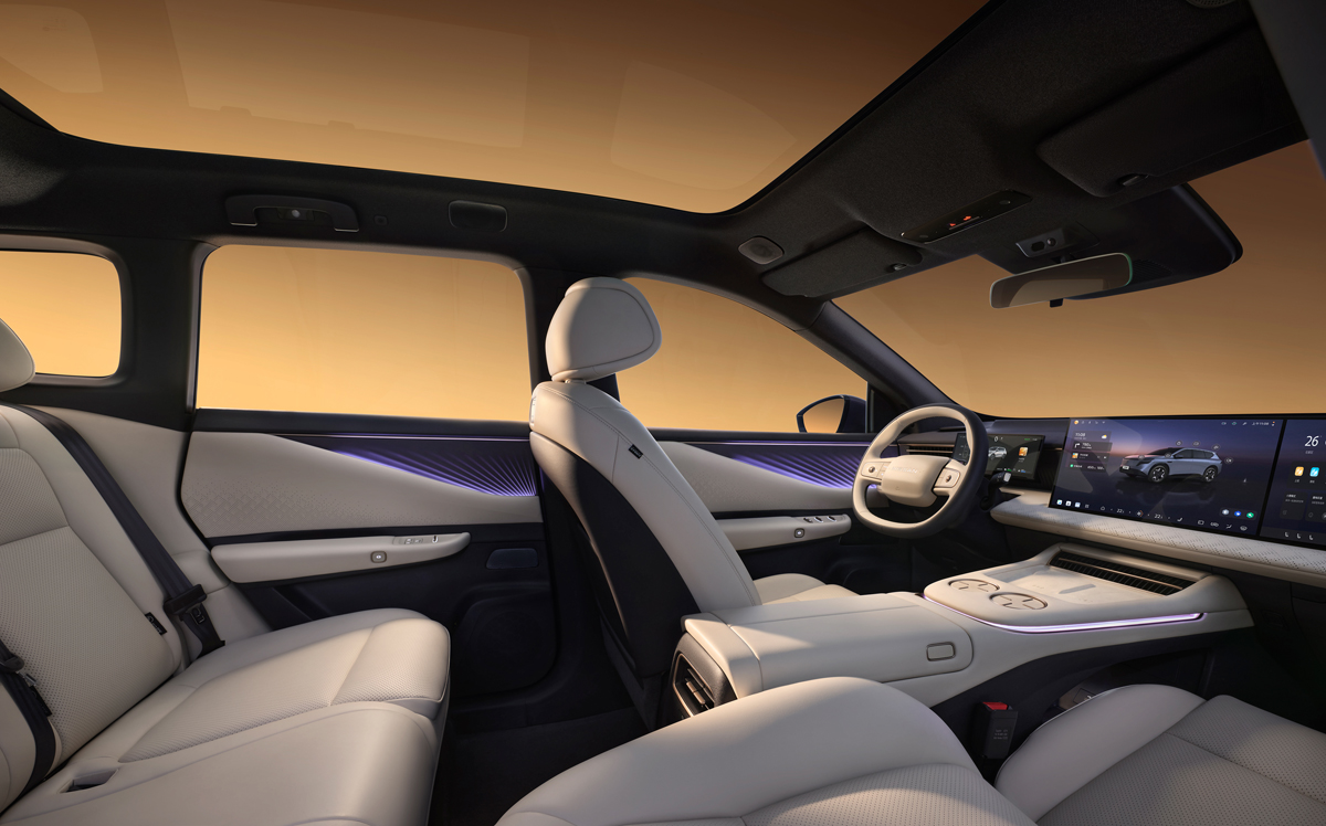 内饰方面,环抱式座舱开阔通透,凝脂材质座椅温润细腻,所有边角都经过圆润处理,不用担心磕碰。256色光瀑式氛围灯“见光不见灯”,氛围感拉满。