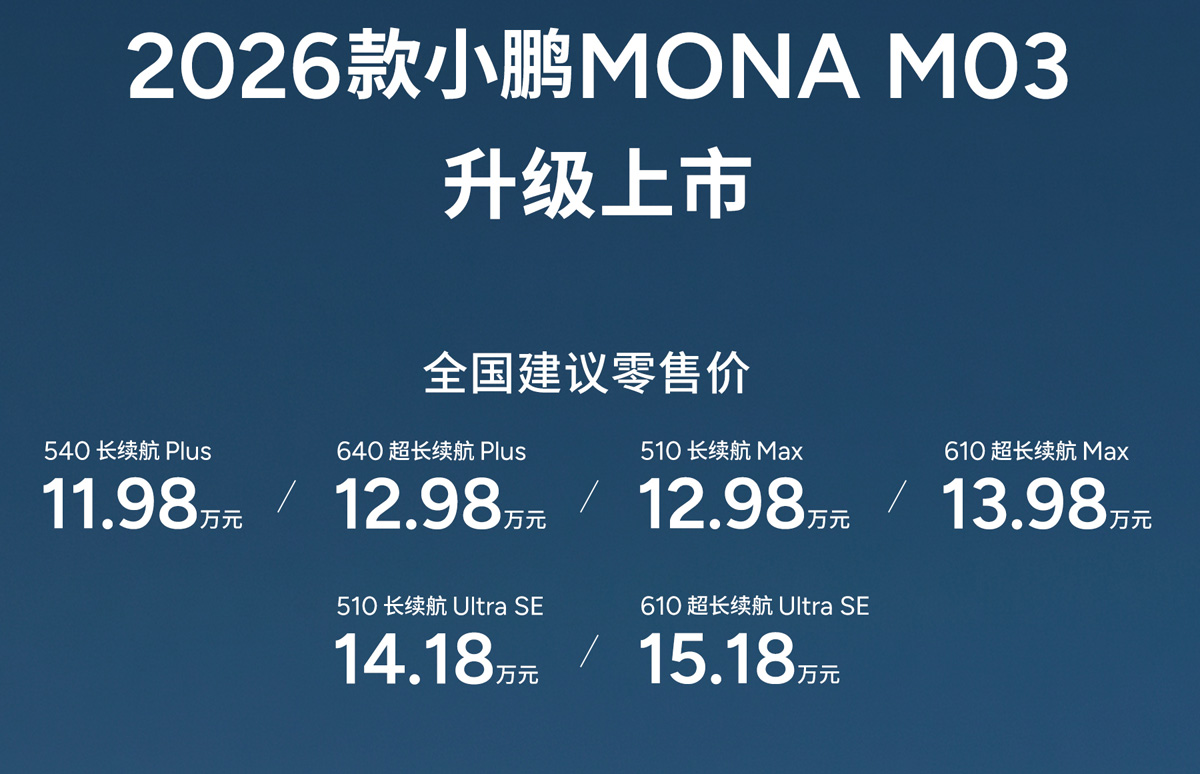 4月2日,2026款小鹏MONA M03正式上市,新车共推出6款车型,官方指导售价依次为:540长续航Plus 11.98万元、640超长续航Plus 12.98万元、510长续航Max 12.98万元、610超长续航Max 13.98万元、510长续航Ultra SE 14.18万元及610超长续航Ultra SE 15.18万元。