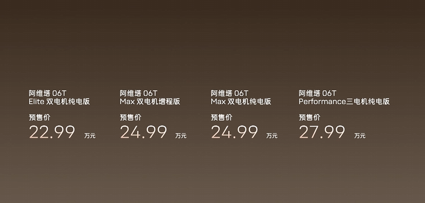 此次发布会,阿维塔06T也开启预售。新车定位 “智美全场景运动轿车”,共推出4款车型版本,预售价22.99万-27.99万元。订车用户可享2000元意向金抵扣5000元大定定金,以及限量 5000份的阿维塔 x 宁德时代联名超薄磁吸充电宝。