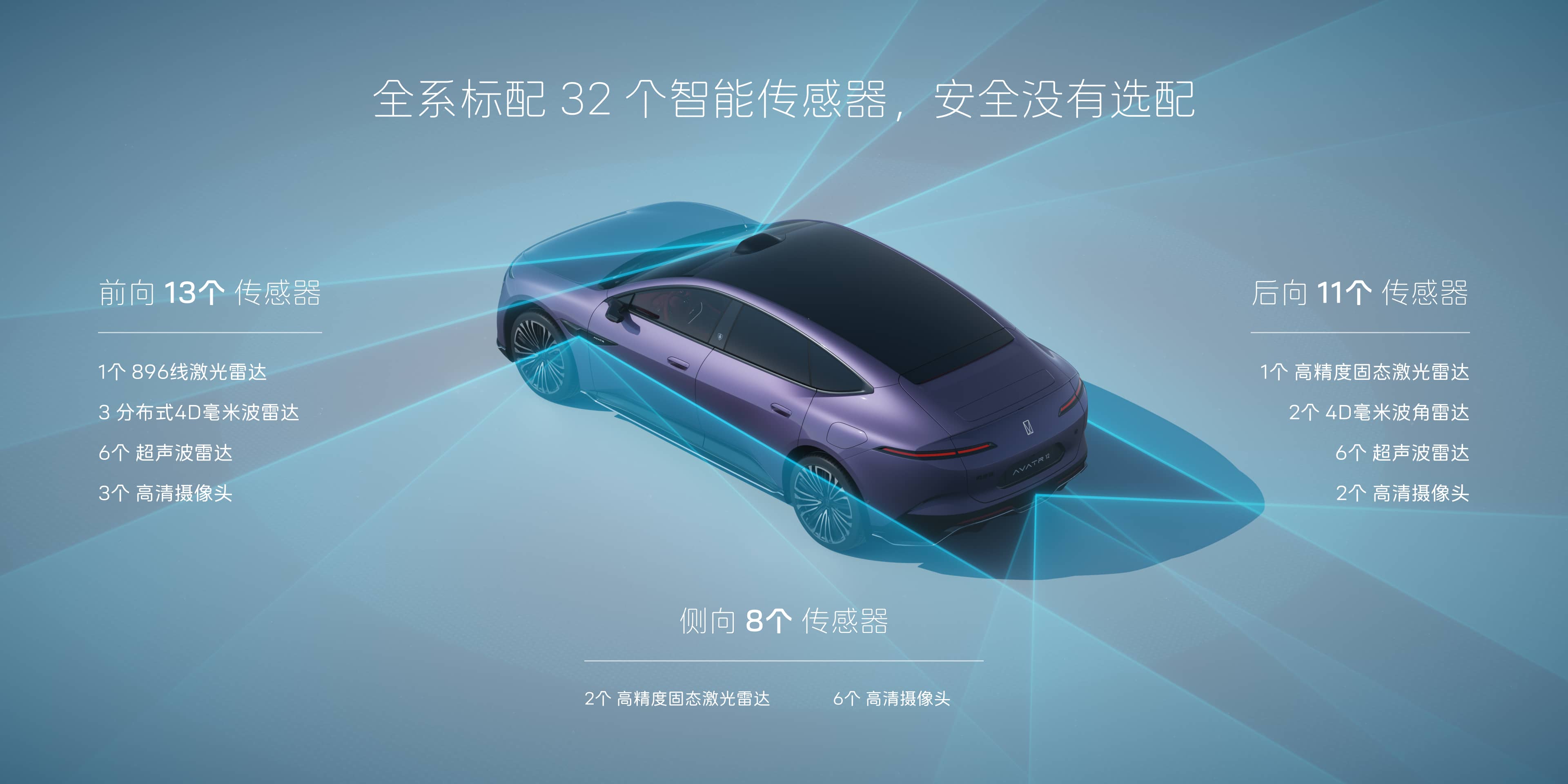 新阿维塔12搭载华为乾崑1颗896线激光雷达、3颗4D毫米波雷达、3颗高精度固态激光雷达、11颗高清摄像头、12个超声波雷达,全系标配32个智能传感器,形成覆盖高速、城区、泊车等高频场景的强大感知体系。
