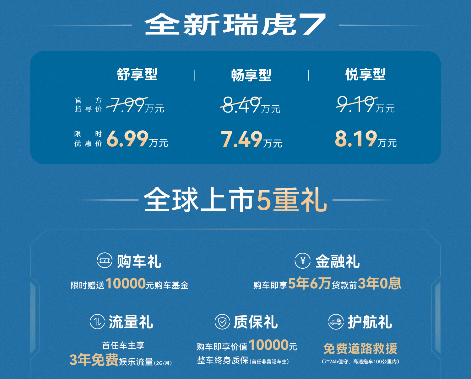 4月8日,瑞虎7、瑞虎7L与瑞虎5运动版三款新车正式上市,其中瑞虎7共有3款车型,限时优惠价6.99万-8.19万元;瑞虎7L共有4款车型,限时优惠价7.89万-9.99万元;瑞虎5运动版共有3款车型,限时优惠价7.09万-8.09万元。