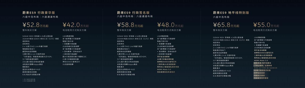 4月9日,蔚来全新科技行政旗舰SUV ES9正式发布并开启预售,新车共有三款车型,其中:ES9行政豪华版预售价52.8万元起,采用BaaS电池租用方式购买,预售价42万元起;行政签名版预售价58.8万元起,采用BaaS电池租用方式购买,预售价48万元起,地平线特别版预售价65.8万元起,采用BaaS电池租用方式购买,预售价55万元起。