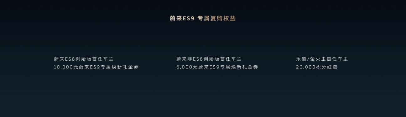 自2026年4月9日(含)起至正式上市发布前,预订蔚来ES9的用户,将享受限时预订权益,支付5000元预订金,可抵扣10000元购车款。蔚来还为老用户提供了ES9的专属复购礼遇:蔚来ES8创始版首任车主可享10000元ES9专属焕新礼金券,蔚来非ES8创始版首任车主可享6000元ES9专属焕新礼金券;乐道、萤火虫首任车主每人可享2万复购积分红包。