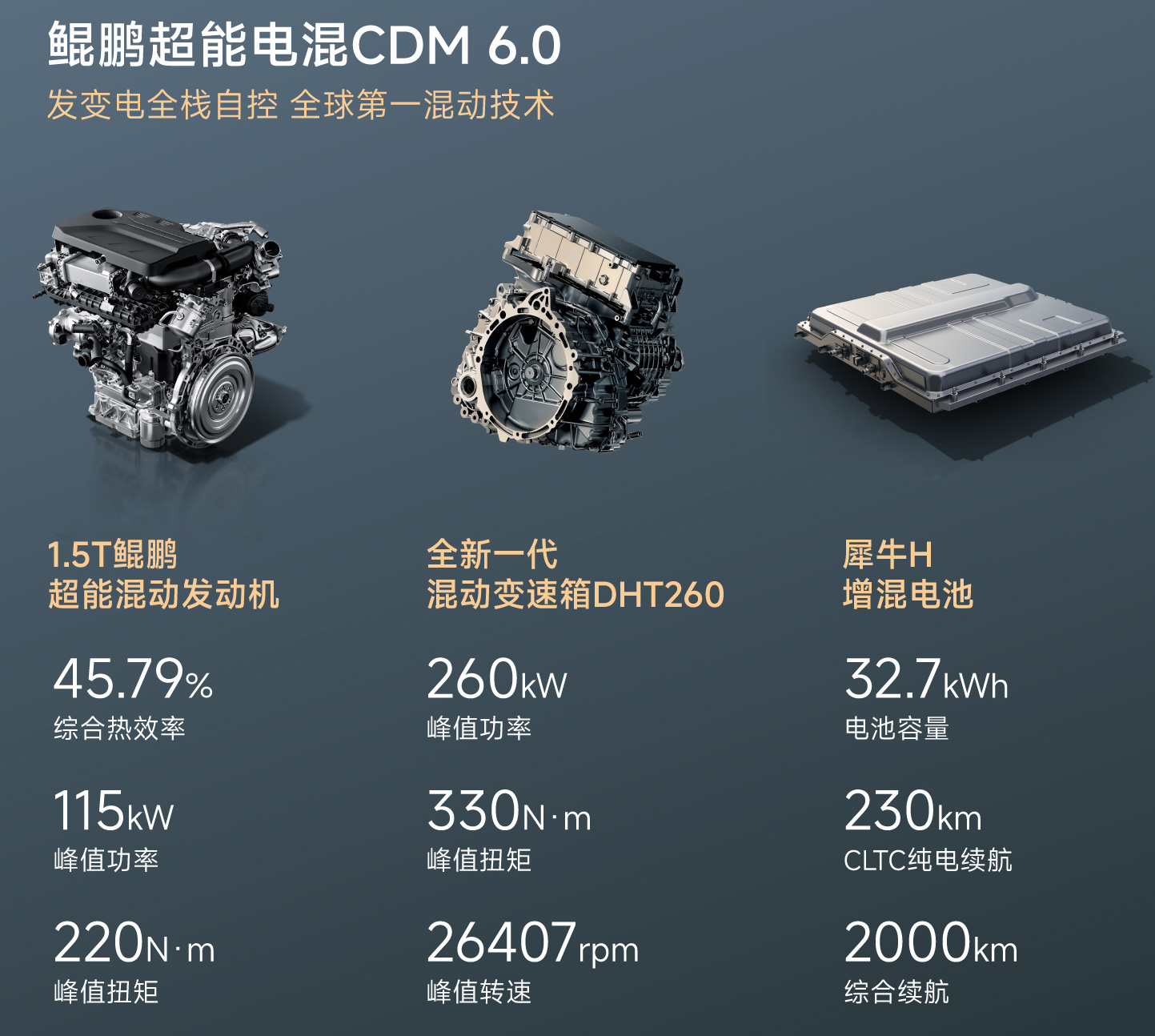 全新一代混动变速箱DHT260,最大功率260kW、峰值扭矩330N·m,最高98.5%机械效率,系统电驱效率90%,实测26407rpm峰值转速。