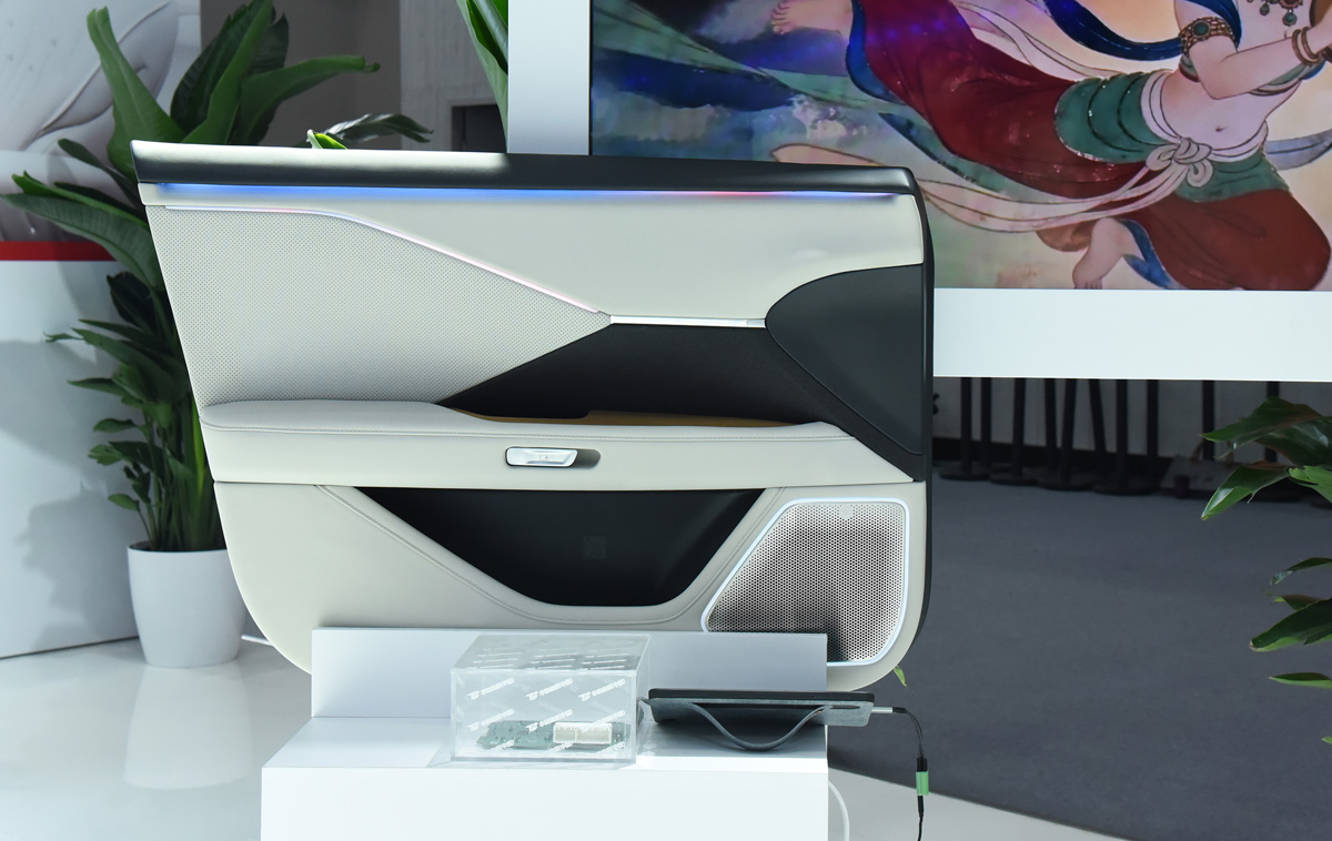 “LOUNZE+”通过座椅、门内饰、中央控制台等内装部件的联动设计,可在影音娱乐、舒适休憩等多种使用场景之间灵活切换,营造如同居家客厅般的空间氛围。在造型与材质上,概念模型采用温润的曲面设计与富有质感的材料搭配,呈现柔和而不失高级感的内饰风格。