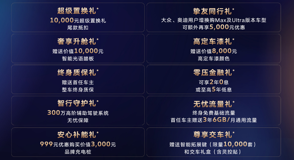 5月31日前下定的用户可享受包括免费享受整车终身质保、赠送价值8000元高定车漆颜色、免费赠送辅助驾驶无忧保障险、免费赠送高品质原装踏板、10000元超级置换礼尾款抵扣、大众奥迪品牌车主增换购ID. ERA 9X的Max或Ultra版本,可额外再享5000元优惠等权益。