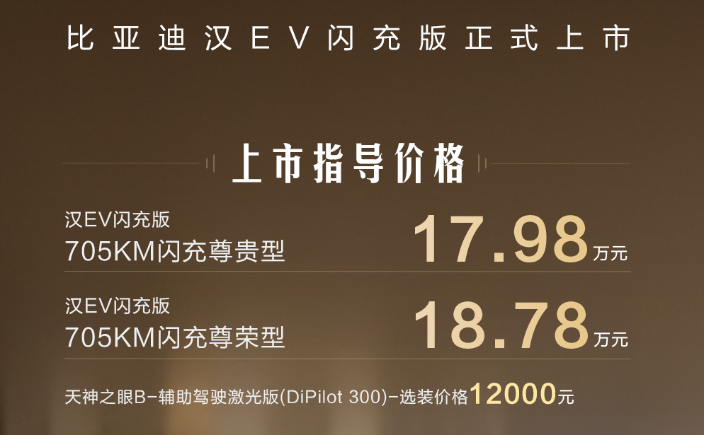 比亚迪汉EV闪充版正式上市 售价17.98万-18.78万元